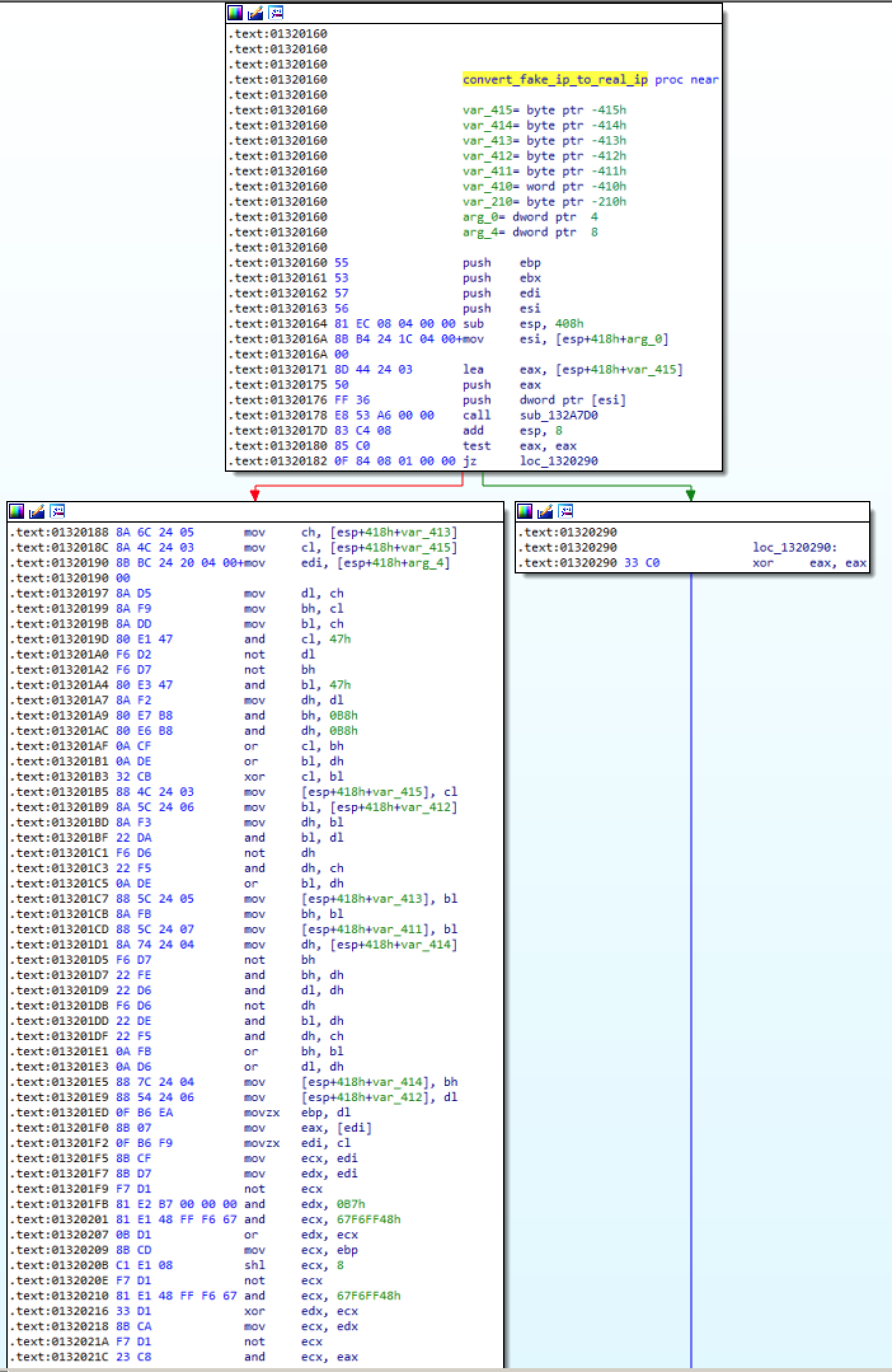 As usual, the Trickbot config blob is XOR and AES encrypted so we have to find new functions which are executed after the config decryption and ideally taking the config decryption output as an argument. If you are using BinDiff, you should be able to spot it quite fast, just watch out for this beauty: