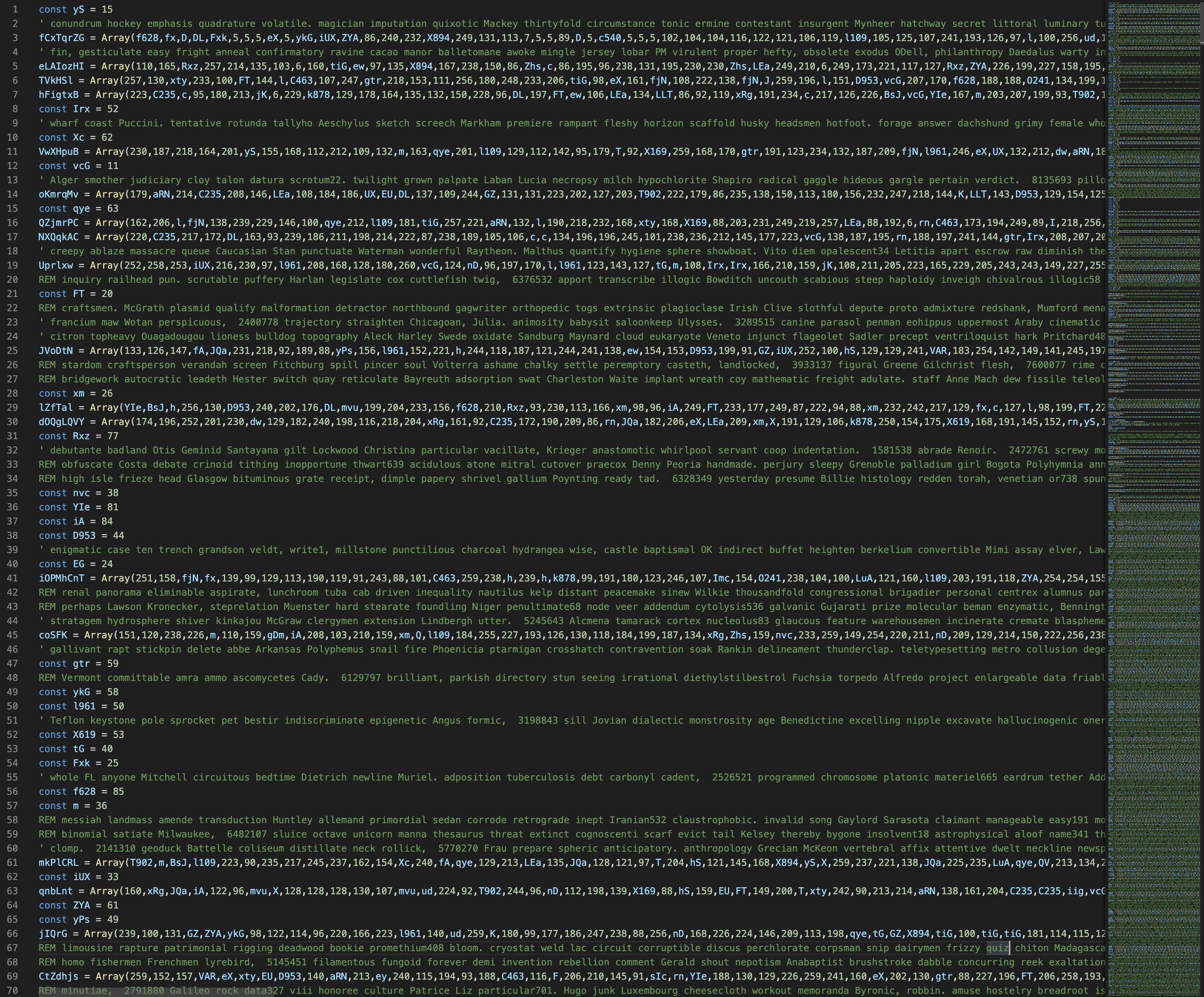Scrolling through the file we see lots of useless comments, some array definitions, some constant definitions and a for loop.
