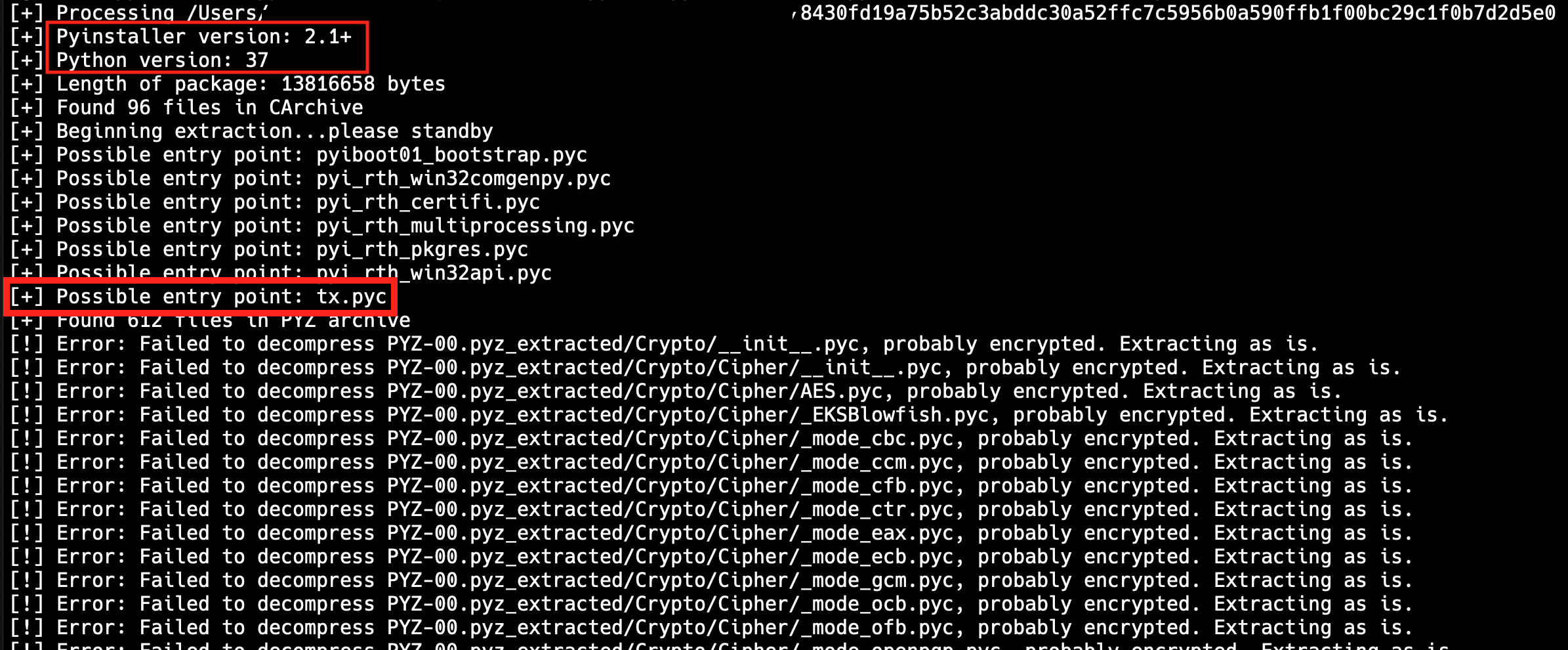 As also described on the PyInstaller Extractor Github page, we now can try to decompile the pyc files. Since tx.pyc is the suggested entry point, we will start with that. Before decompiling the pyc file we need to fix the header because PyInstaller removed those bytes. In order to do so, we just add the following bytes at the beginning of the file 42 0d 0d 0a 00 00 00 00 e4 b9 18 5d 00 00 00 00.