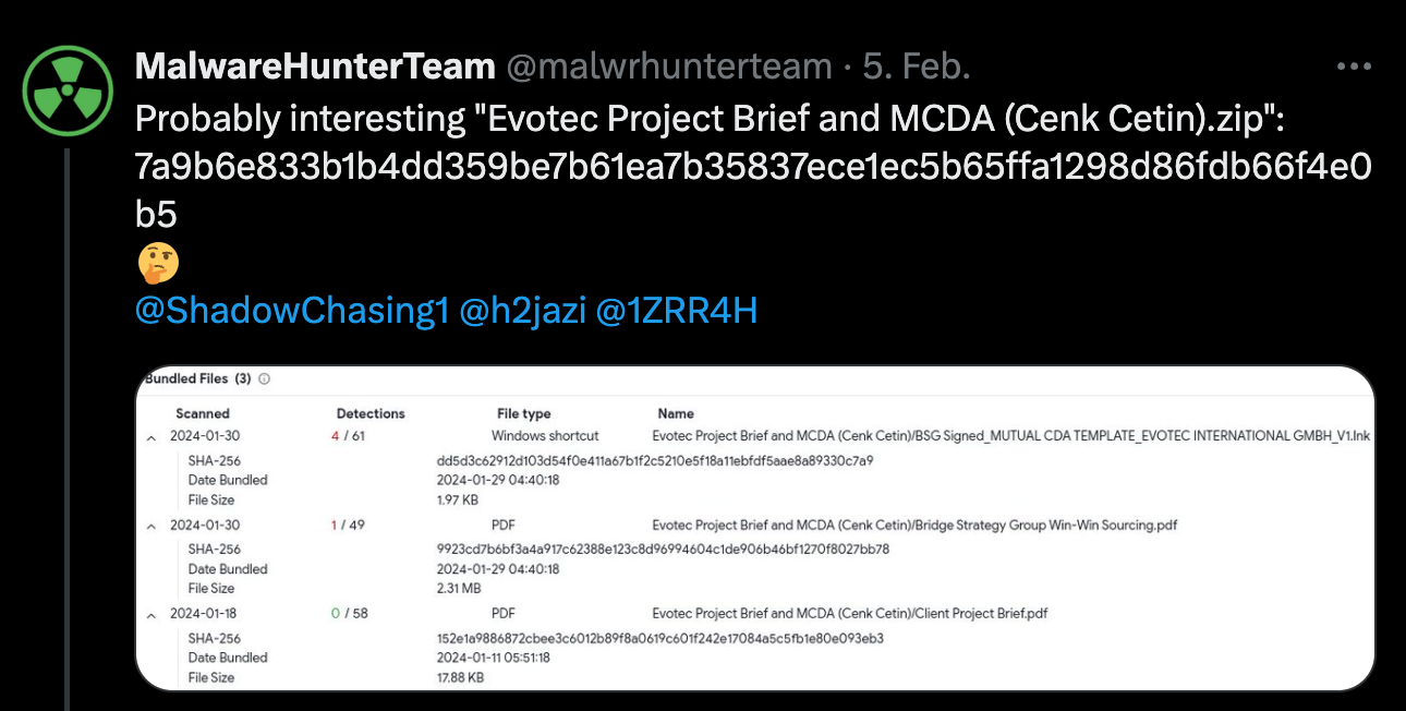 From time to time I tidy up my thousands of open browser tabs, and this time I came across something that I wanted to look at a few weeks ago but had forgotten about. It’s a tweet from MalwareHunterTeam about a probably interesting sample called Evotec Project Brief and MCDA (Cenk Cetin).zip.